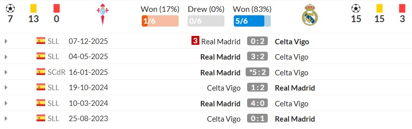 Thống kê đối đầu giữa Celta Vigo vs Real Madrid cho thấy Real Madrid thực sự là “khắc tinh” của Celta Vigo trong nhiều mùa giải gần đây. Trong 6 lần chạm trán mới nhất giữa Celta Vigo vs Real Madrid, Real Madrid thắng tới 5 trận, chỉ một lần phải nhận thất bại. Không ít lần họ ghi từ hai đến bốn bàn vào lưới Celta Vigo, thể hiện sự vượt trội cả về đẳng cấp lẫn khả năng tận dụng cơ hội.
