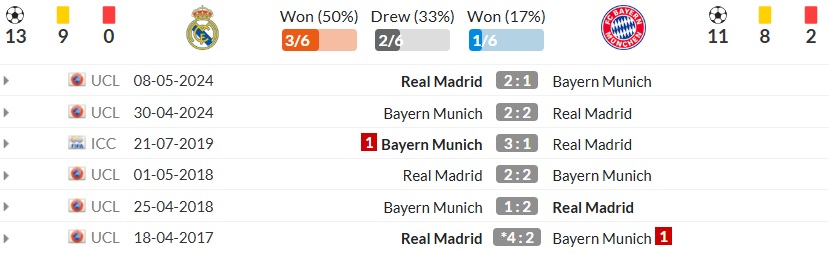Lịch sử đối đầu gần đây của Real Madrid vs Bayern cho thấy sự nhỉnh hơn vừa đủ của đội bóng Tây Ban Nha. Theo dữ liệu bạn gửi, trong 6 lần chạm trán gần nhất, Real Madrid thắng 3, hòa 2 và Bayern thắng 1. Nếu chỉ nhìn vào con số, Real Madrid là đội có lợi thế. Nhưng khi đi sâu hơn vào diễn biến, có thể thấy Real Madrid vs Bayern hiếm khi là cặp đấu một chiều.