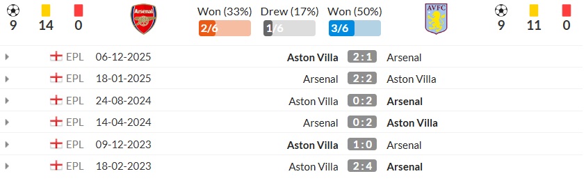 Nhìn vào 6 lần gặp nhau gần nhất giữa Arsenal vs Aston Villa: Arsenal thắng 2 trận, Aston Villa thắng 3 trận, Hai đội hòa 1 trận. Đáng chú ý, trong 3 lần chạm trán gần nhất, Aston Villa thắng 2 và hòa 1, trong đó có trận thắng 2-0 ngay tại Emirates mùa trước và chiến thắng 2-1 ở lượt đi mùa này. Điều này cho thấy Aston Villa không hề e ngại khi đối đầu Arsenal, thậm chí còn trở thành “kỵ giơ” thực sự của Pháo thủ trong giai đoạn gần đây.