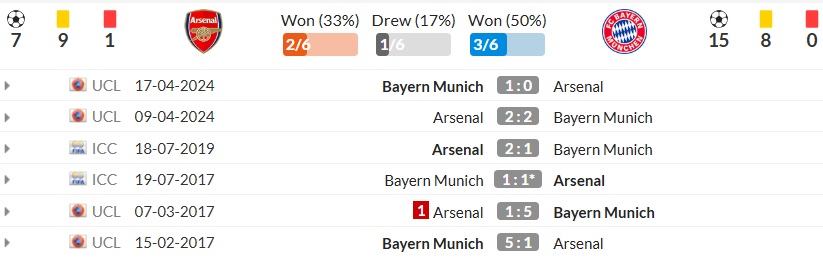 Trong 6 lần gặp nhau gần nhất giữa Arsenal vs Bayern, Bayern nhỉnh hơn với 3 chiến thắng, Arsenal thắng 2 và có 1 trận hòa. Đáng chú ý, nhiều trận đấu giữa hai đội đã trở thành ký ức khó quên với người hâm mộ: từ những chiến thắng 5–1 của Bayern cho tới cuộc rượt đuổi tỉ số 2–2 hay những trận thắng sát nút đầy toan tính chiến thuật.