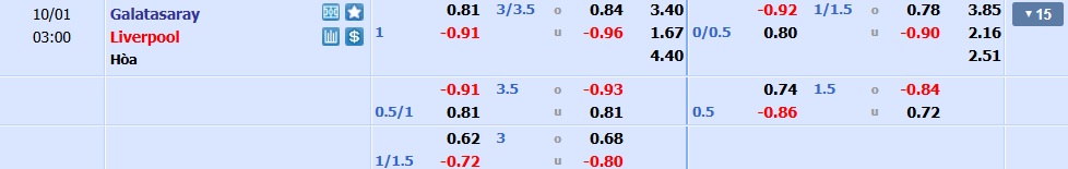 Theo tỷ lệ kèo hiện tại của trận Galatasaray vs Liverpool, Liverpool chấp 1 trái với mức ăn cân bằng cho cả hai cửa. Điều này cho thấy giới chuyên môn vẫn đánh giá cao sức mạnh của đại diện nước Anh, dù họ phải làm khách. Kèo tài xỉu ở mức 3/3.5 phản ánh kỳ vọng về một trận đấu nhiều bàn thắng, khi cả hai đội đều có hàng công bùng nổ.