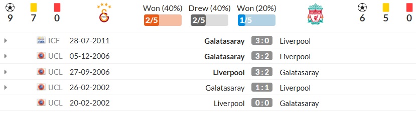 Trong 5 lần gặp nhau gần nhất, Galatasaray thắng 2, Liverpool thắng 1 và có 2 trận hòa. Đáng chú ý, Galatasaray thường chơi rất khó chịu mỗi khi tiếp đón Liverpool trên sân nhà, với những chiến thắng ấn tượng 3-0 và 3-2 trong quá khứ.