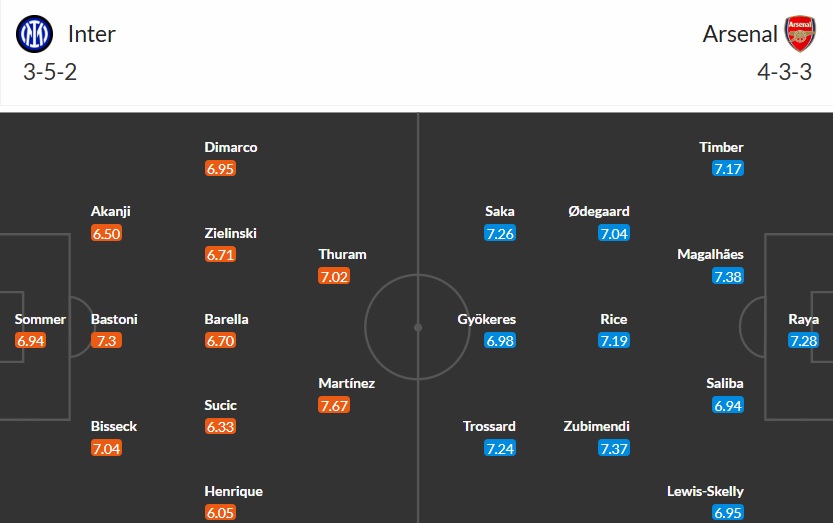 Theo sơ đồ ra sân dự kiến của trận Inter vs Arsenal, Inter ra sân với hệ thống 3-5-2 quen thuộc. Ba trung vệ tạo thành bức tường chắn trước khung thành, hai cầu thủ chạy cánh bó vào trong khi phòng ngự và bung ra biên rất nhanh khi tổ chức tấn công. Tuyến giữa gồm ba tiền vệ có xu hướng chia vai rõ ràng: một người giữ nhịp và che chắn, hai người còn lại di chuyển rộng để tham gia pressing và hỗ trợ tấn công.