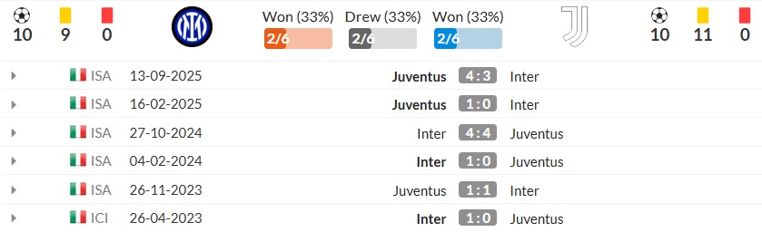 6 lần chạm trán gần nhất giữa Inter vs Juventus tại Serie A và các giải cúp đã cho thấy sự cân bằng đầy căng thẳng: