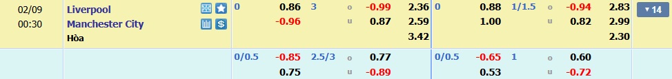 Kèo chính CMD368 đưa ra cho trận Liverpool vs Man City là đồng banh (0:0), chênh lệch Liverpool thấp hơn đôi chút, cho thấy thị trường phần nào nghiêng về cửa chủ nhà.