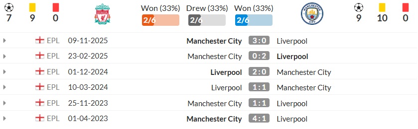 Sáu lần gặp nhau gần đây giữa Liverpool vs Man City tại Premier League chứng kiến sự cân bằng rõ rệt: