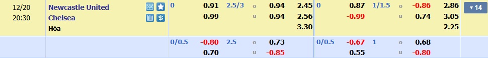 Tỷ lệ châu Á chính: đồng banh (0:0) cho trận Newcastle vs Chelsea. Các kèo phụ đã bắt đầu xuất hiện mức Newcastle chấp nhẹ 0/0.5, cho thấy thị trường có xu hướng đánh giá cao lợi thế sân nhà của Chích chòe.